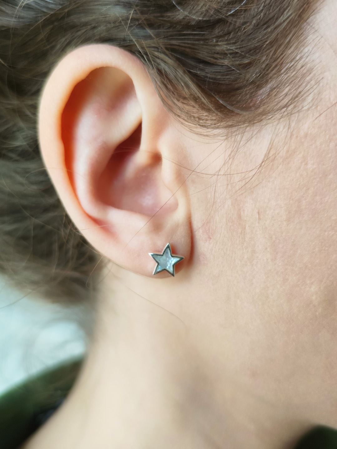 Caravanas en plata 925 y nácar blanco, diseño estrella y luna.