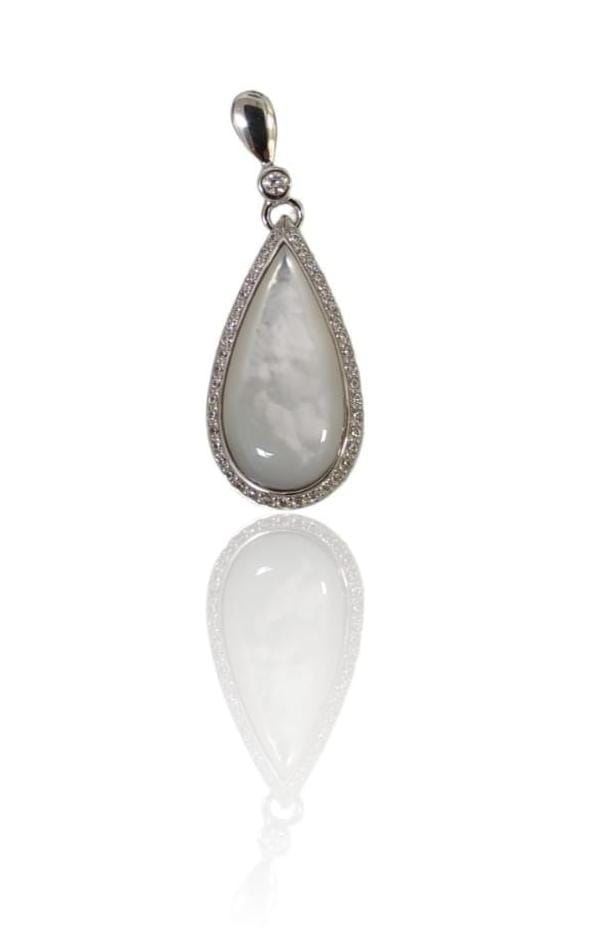 Colgante en plata 925 y nácar en forma de lágrima, rodeada de zirconias. Medida sin argolla: 23mm de alto 12mm ancho abajo.