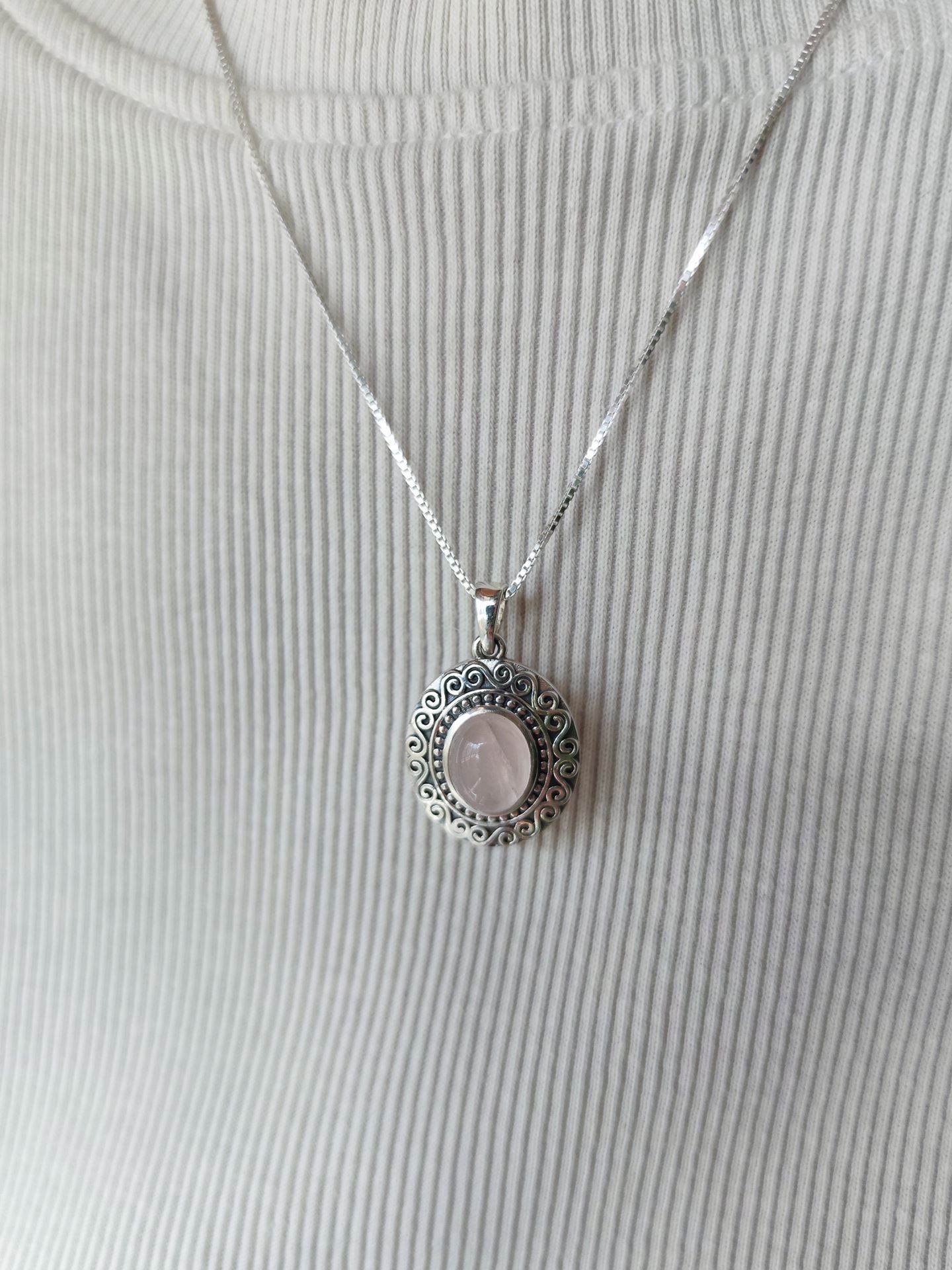 Dije labrado en plata 925 con cuarzo rosa natural.