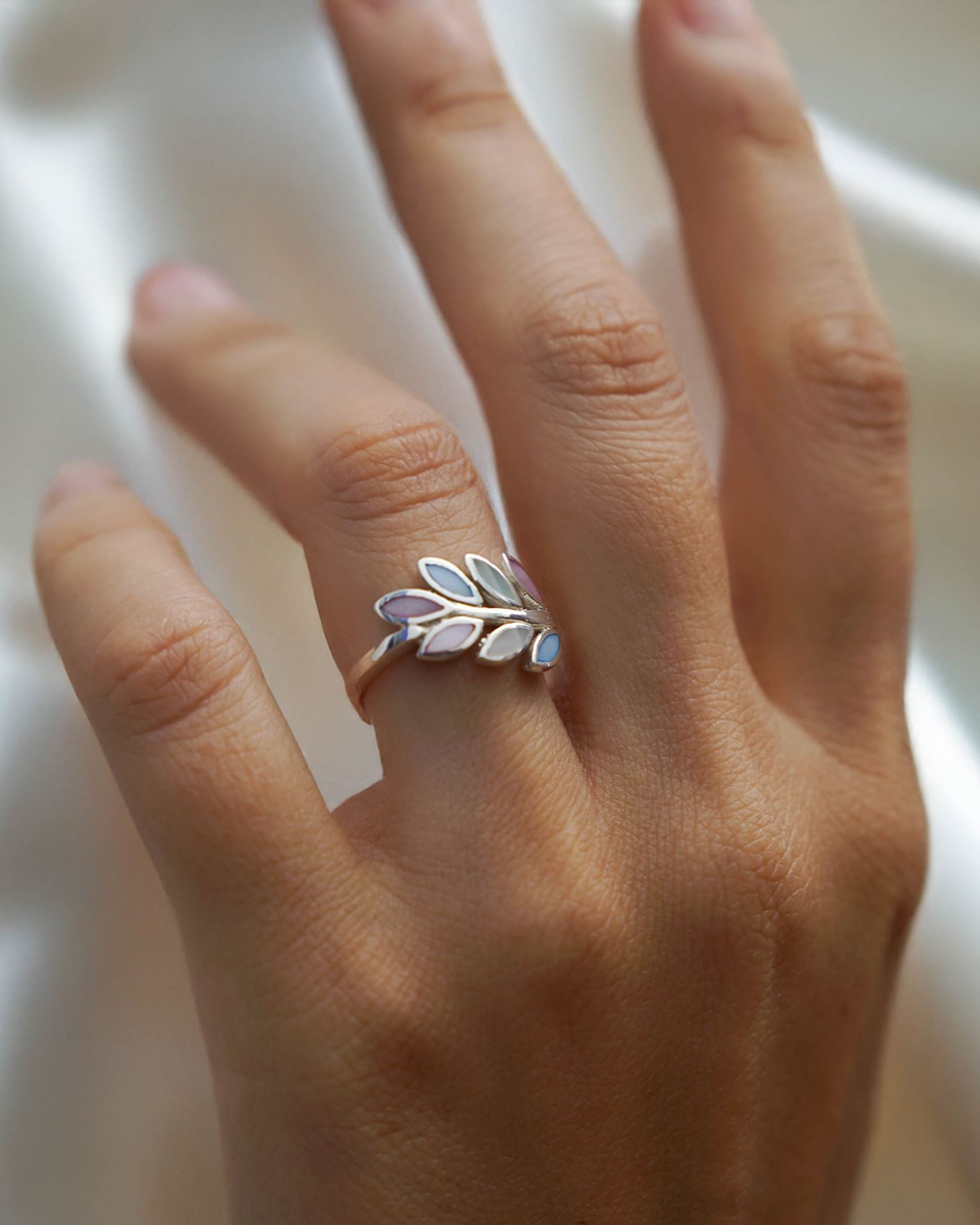 Anillo en Plata 925 con diseño de hojas en nácar blanco, celeste y rosa.