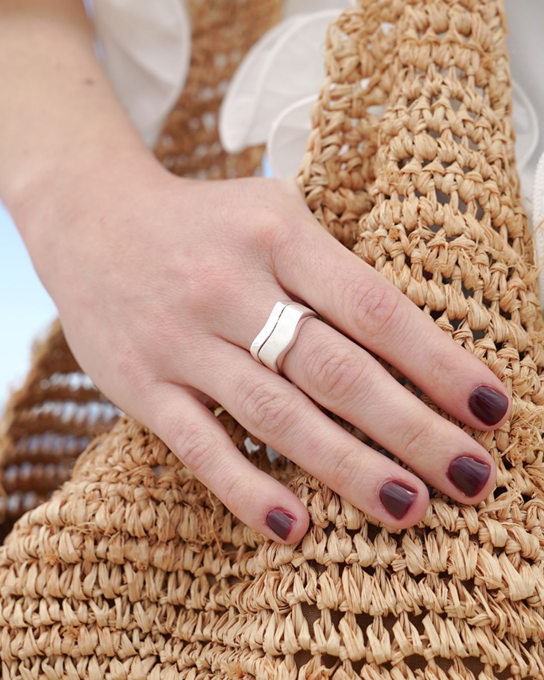 Anillo en plata 925 con forma de v combinado rodinado y arenado.