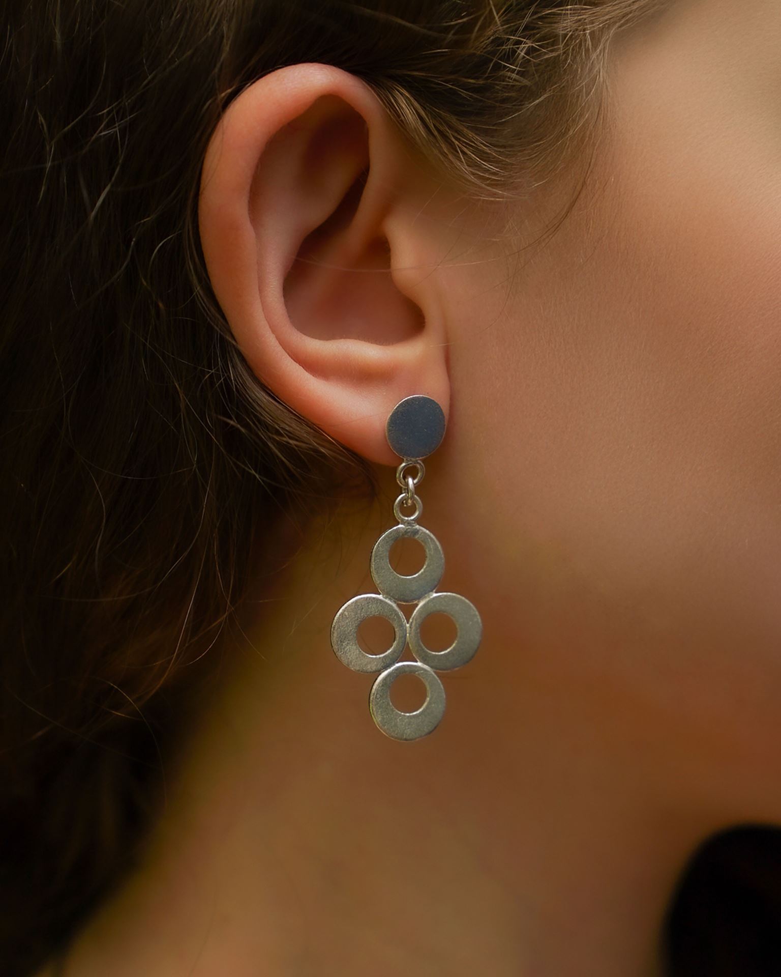 Caravanas pendientes en plata 925 con piezas circulares en plata tono mate.