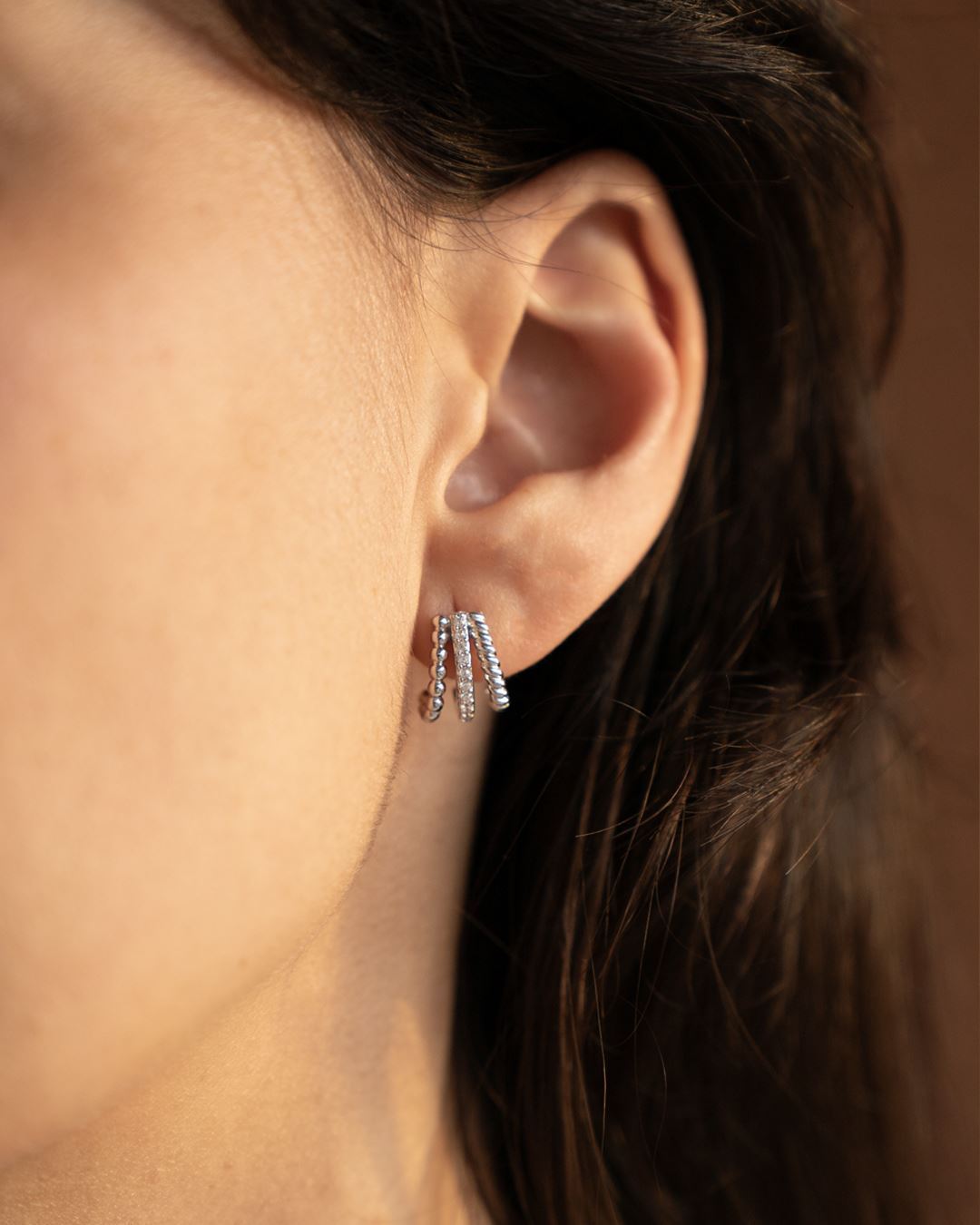 Caravanas en plata 925 con cierre mariposa, diseño triple, zirconias, esferitas, líneas diagonales.