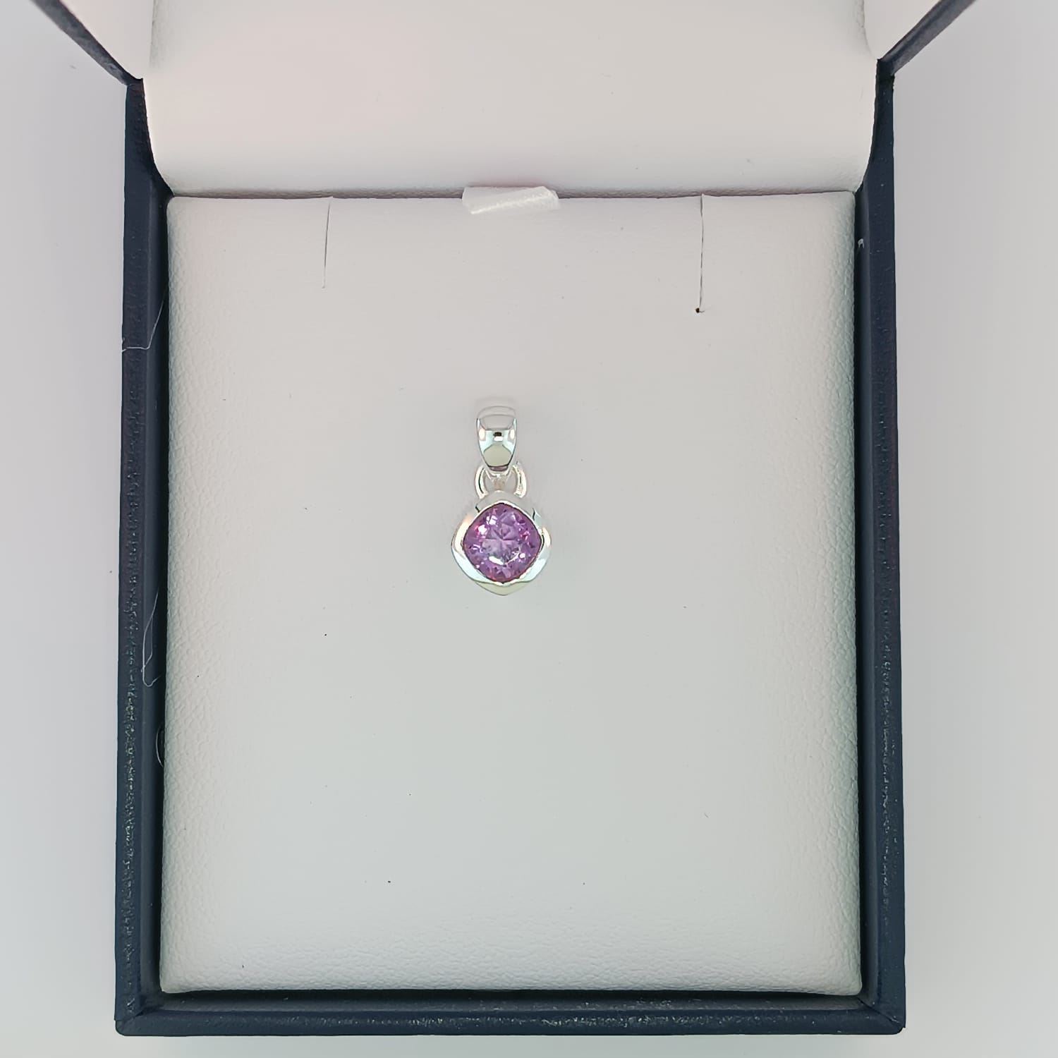 Colgante en plata 925 con piedra amatista legítima facetada. Medida 6mm x 6mm,