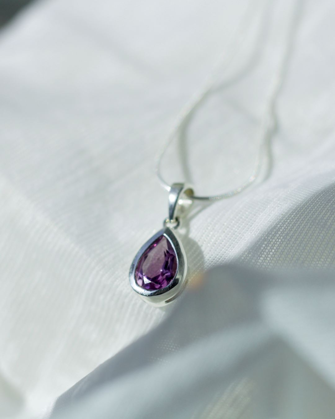 Colgante en plata 925 diseño gota con piedra natural Amatista, símbolo de sabiduría, espiritualidad, paz y armonía