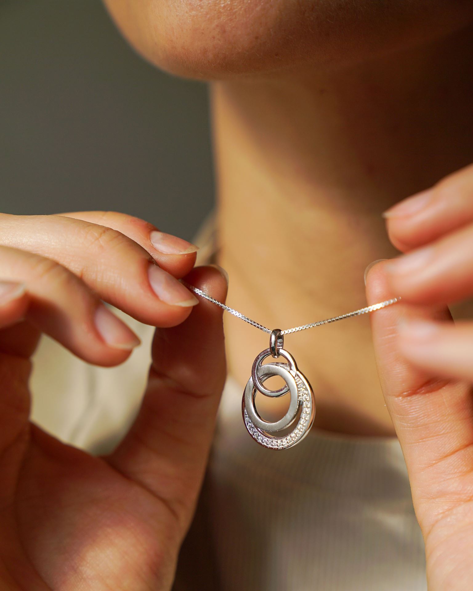 Colgante en Plata 925 con aros entralazados, satinado, rodinado y con zirconias.