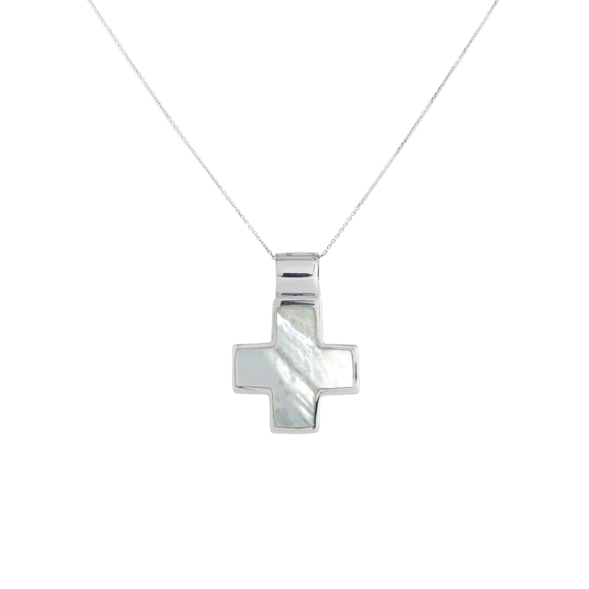 Cruz en Plata 925 con Nácar blanco. Medida: 22m x 22mm. La medida no incluye la argolla-