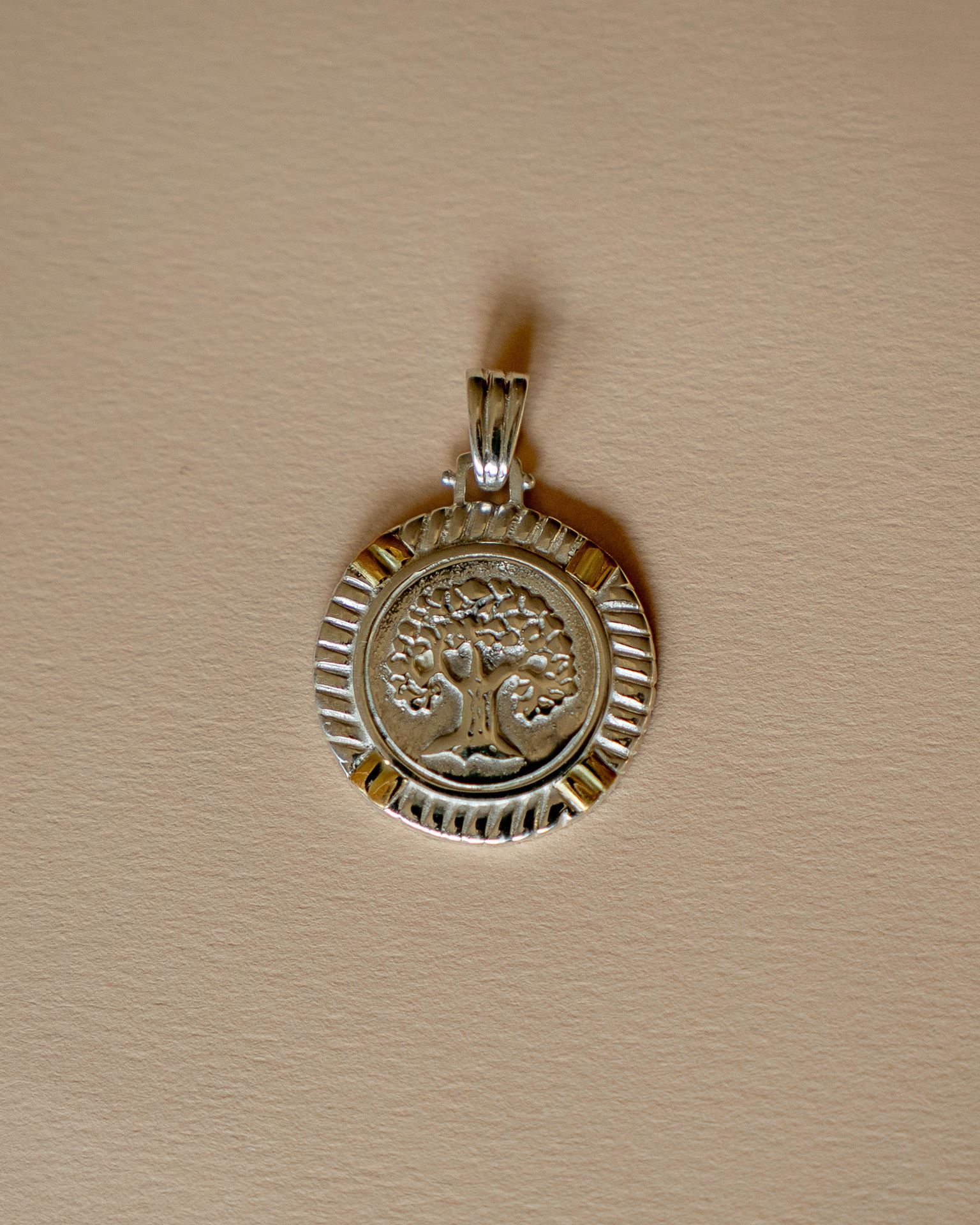 Dije árbol de la vida en plata y oro. Medida: 28 mm diámetro.