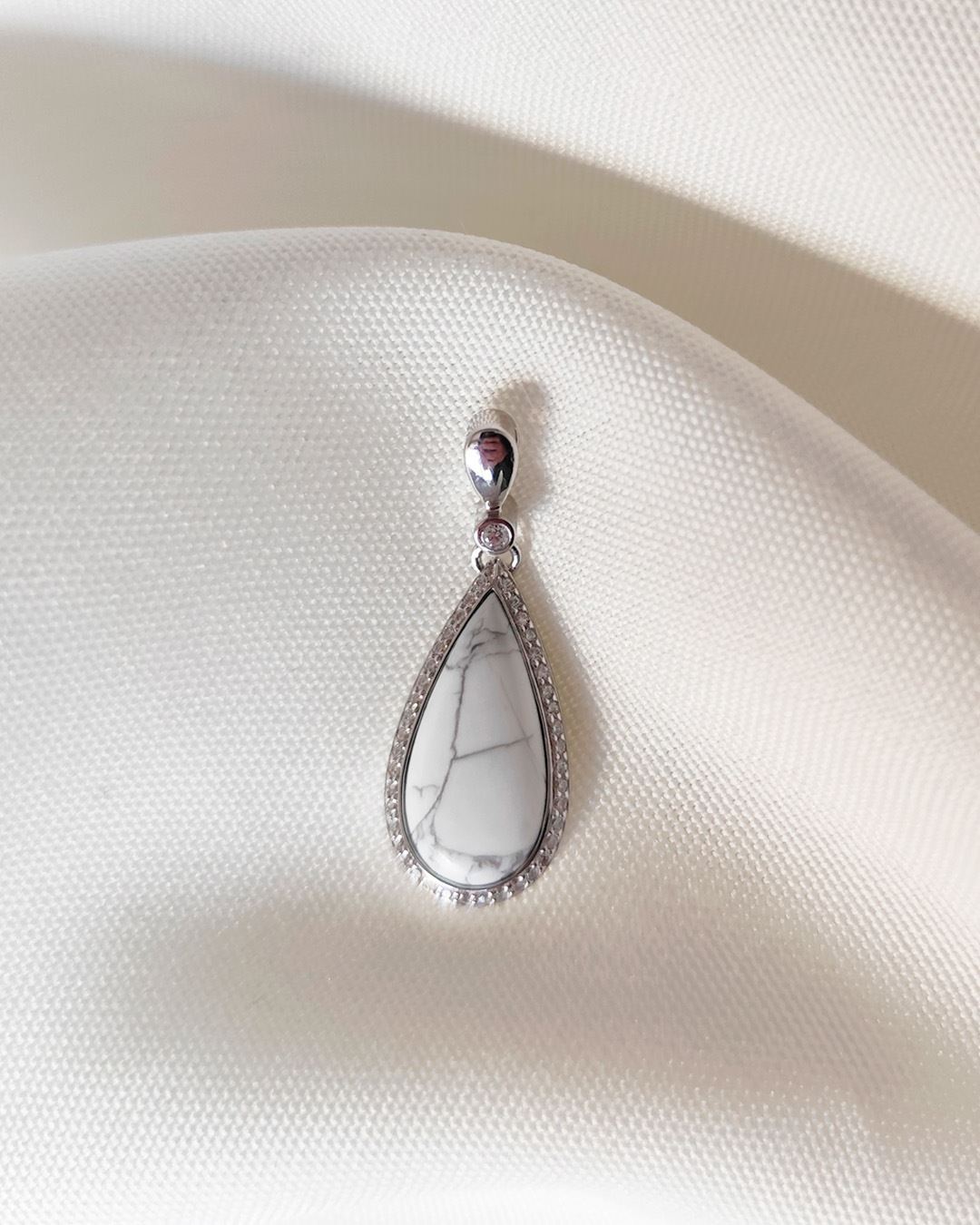 Dije en plata 925 piedra howlita y zirconias. La howlita se asocia con la relajación, la paciencia y la claridad mental.