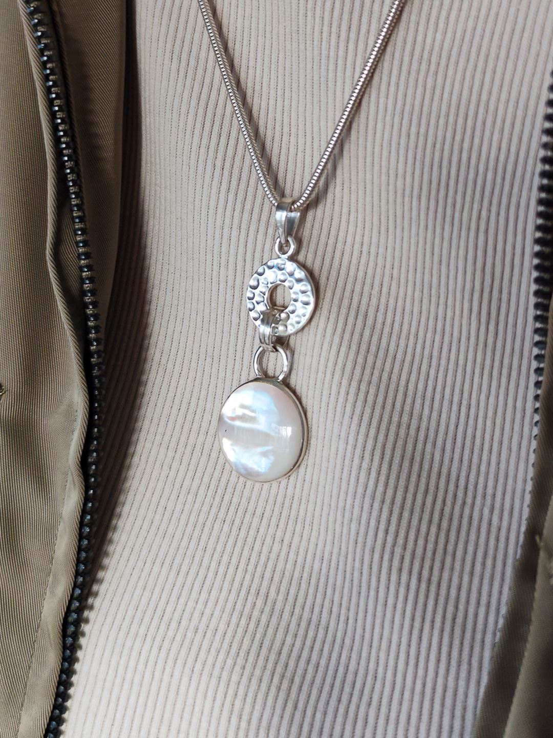 Dije en plata 925 con nácar natural blanco y aro en plata martillado.