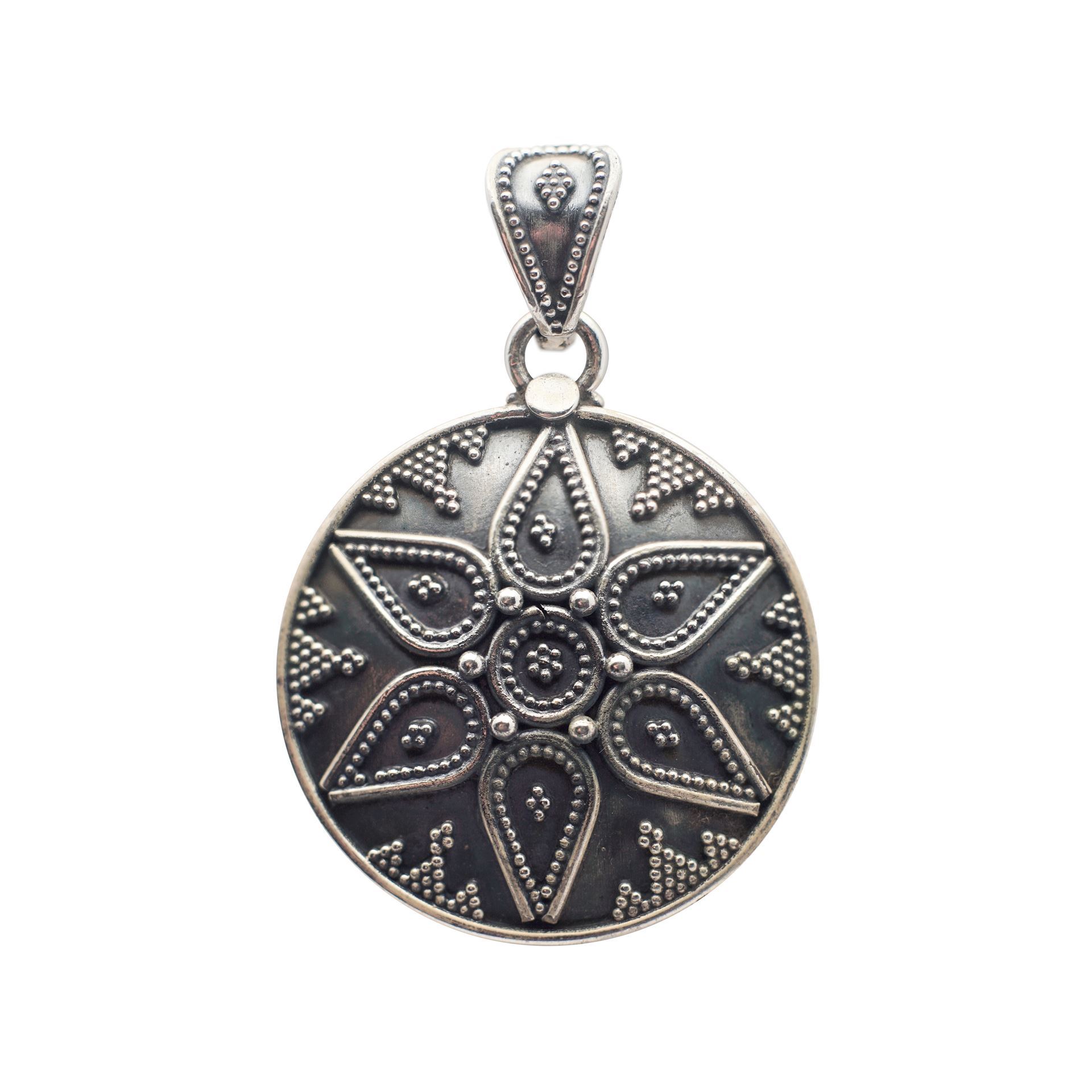 Dije Redondo Plata 925 trabajado en relieve Indú. Medida: 30 mm diámetro, argolla 12mm x 7mm
