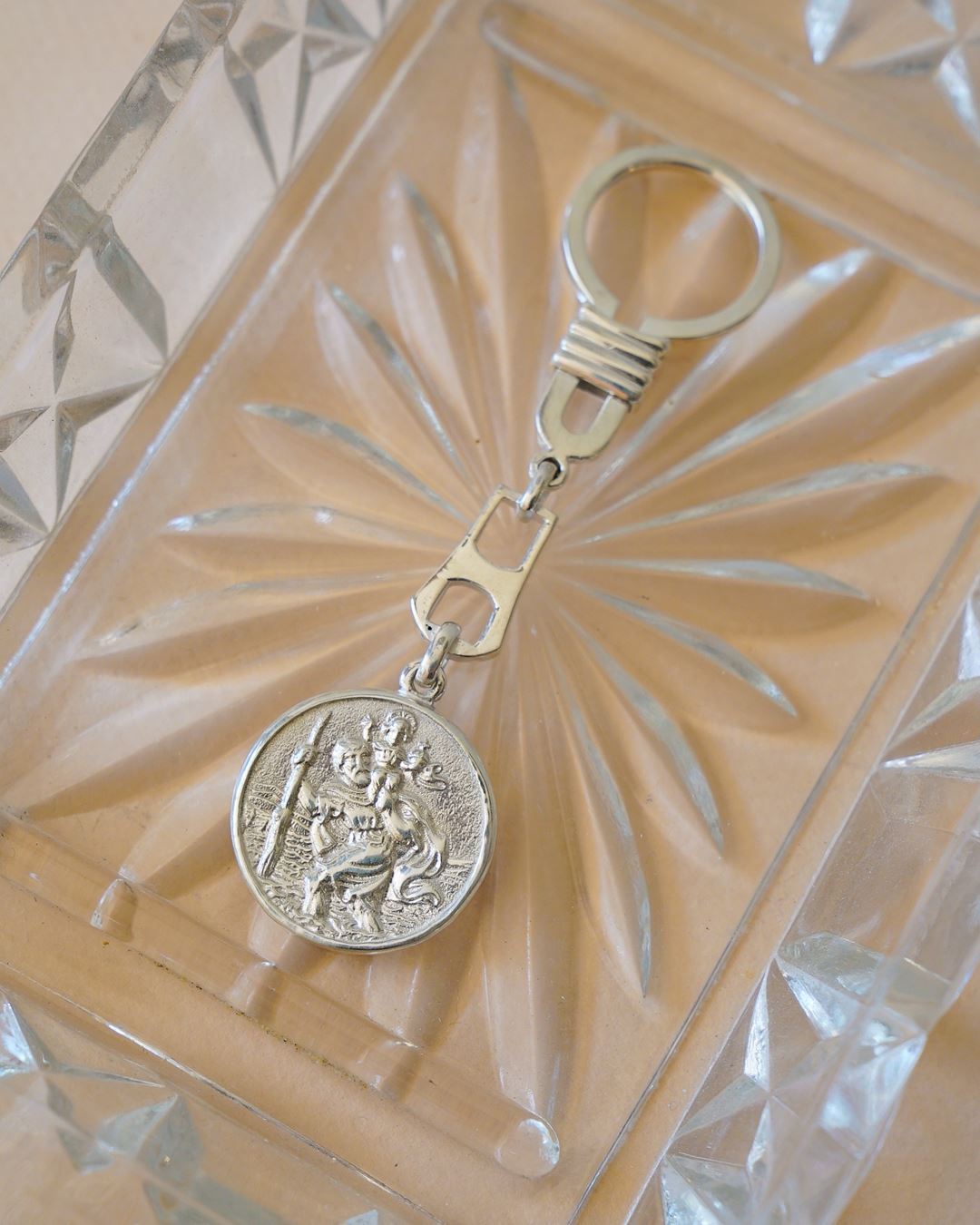 Llavero en plata con imagen de San Cristobal. Patrón de los viajeros. Medida solo medalla 25 mm diámetro.
