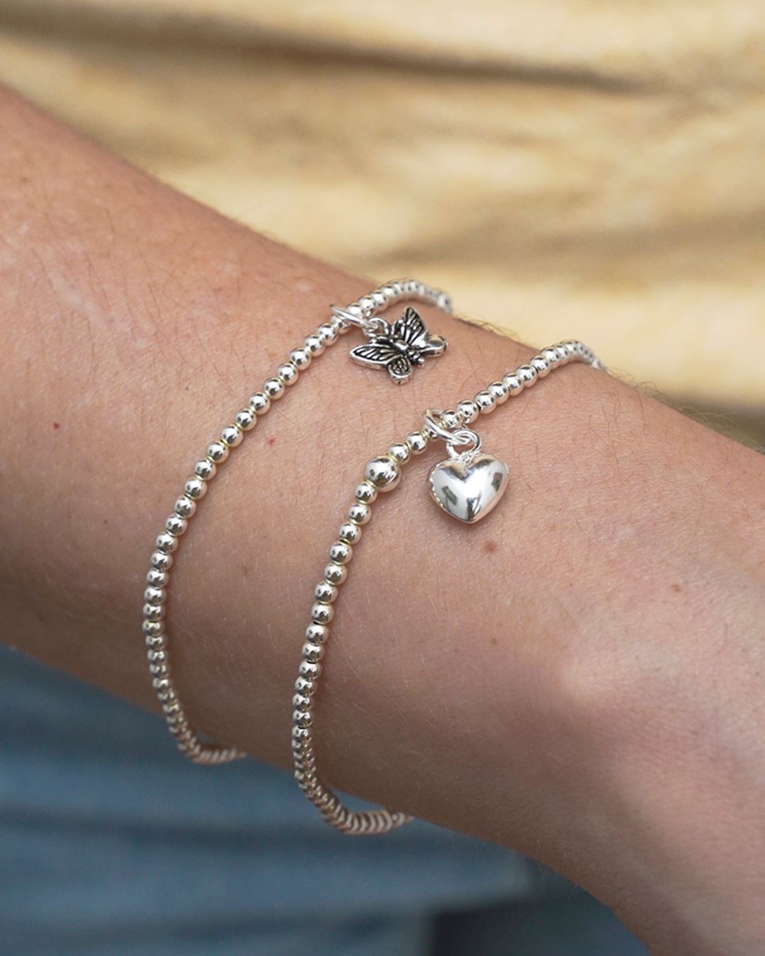 Pulsera elastizada con esferitas en plata 925 con dijes diferentes diseños infinito, mariposa y corazón. Luego de realizar la compra, envía un mensaje al 096657245 con el diseño elegido y te lo enviamos!